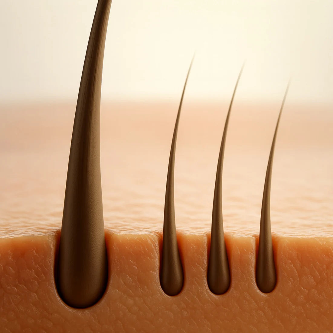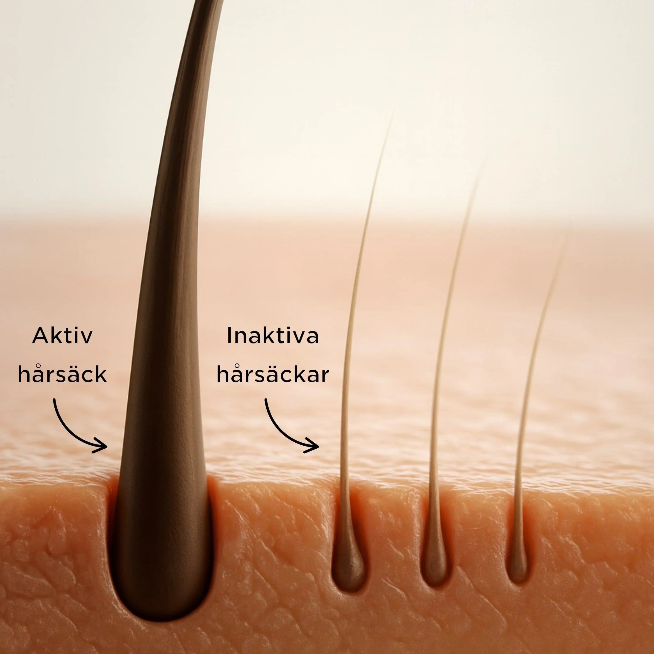 Inaktiva hårsäckar är en vanlig orsak till tunnhårighet. Håret kan verka borta, men små vilande hårstrån finns ofta kvar. För att återfå tillväxt behöver hårsäckarna aktiveras igen.